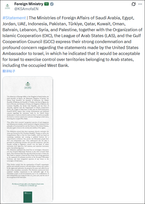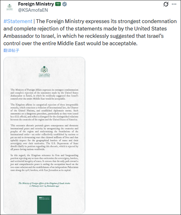 当地时间2月22日,沙特阿拉伯外交部在社交平台上发布了声明,其中称,沙特阿拉伯、埃及、约旦、阿联酋、印度尼西亚、巴基斯坦、土耳其、卡塔尔、科威特、阿曼、巴林、黎巴嫩、叙利亚、巴勒斯坦,连同伊斯兰合作组织、阿拉伯国家联盟、海湾合作委员会,就赫卡比的言论表示强烈谴责和深切关切。